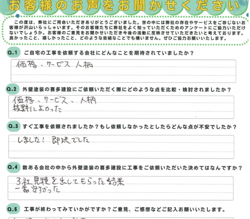 喜多建設は創業103年。地域密着で皆様からご愛顧いただいています。わかりやすい説明、価格、工期や保証内容をきちんとご説明し、ご納得いただいた場合のみご契約させていただいておりますのでご安心ください。